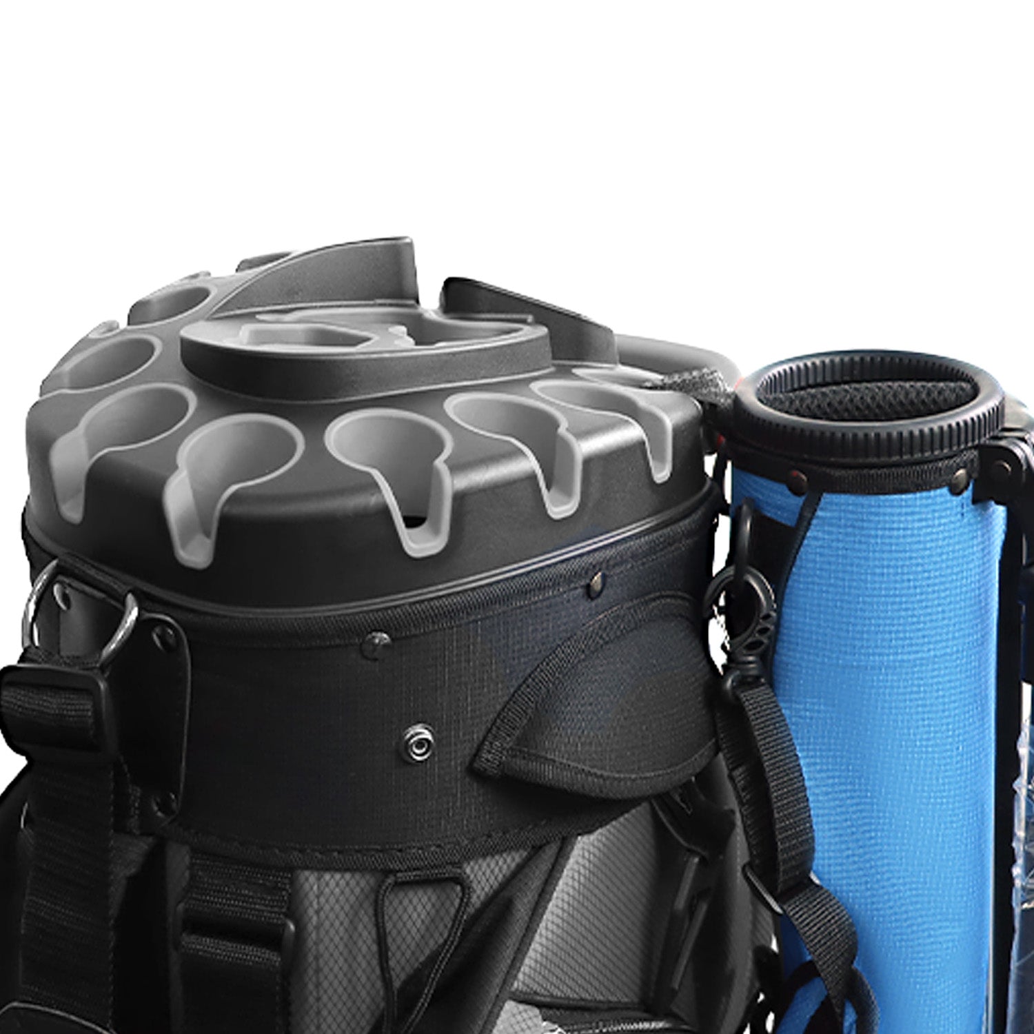 The Golf Cart Bag is designed to fit securely on most golf carts, ensuring stability and ease of use. It includes cart strap pass-through slots for a secure attachment.