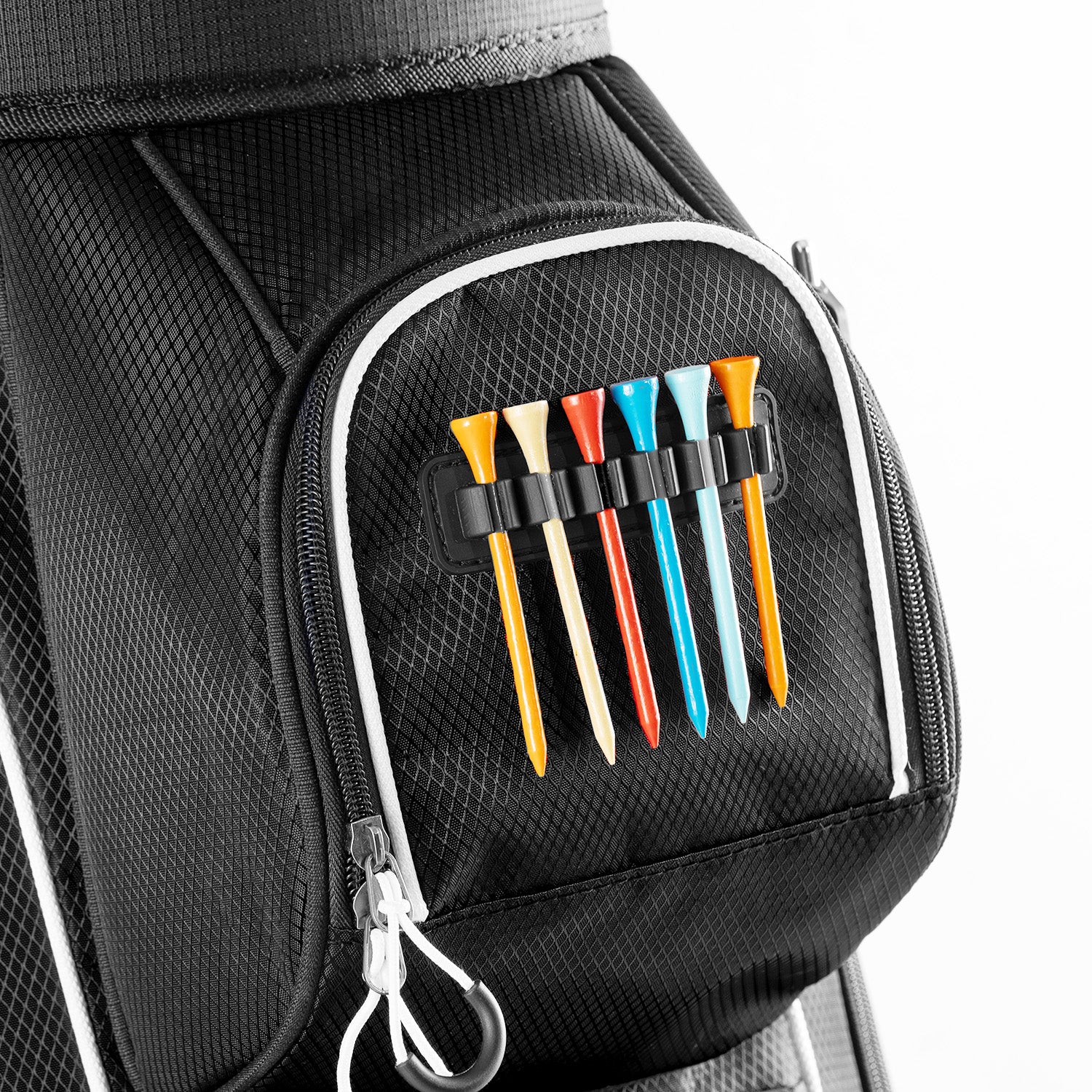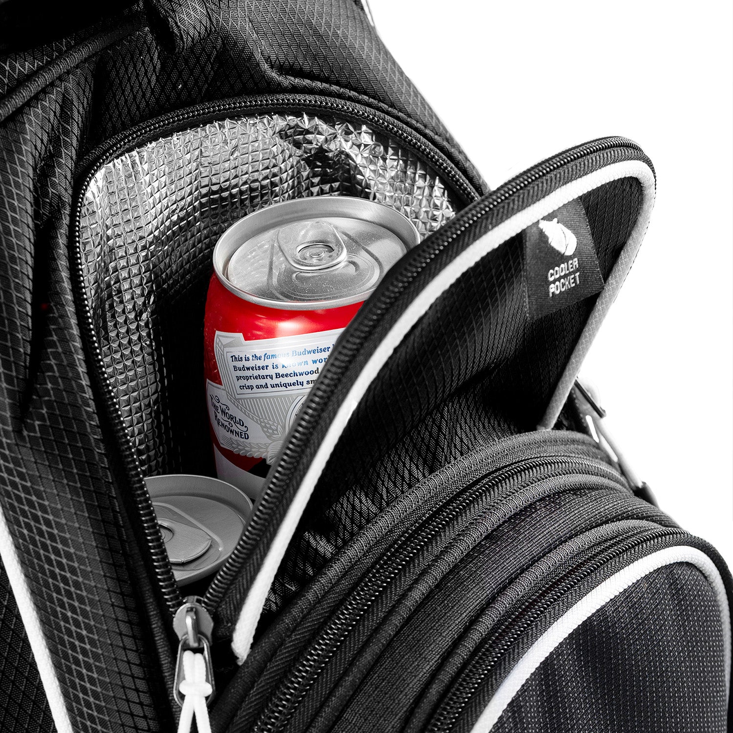 With multiple pockets, including a spacious apparel pocket, cooler pocket, valuables pocket, and more, this golf cart bag offers ample storage space for your golf essentials, snacks, beverages, and personal items.