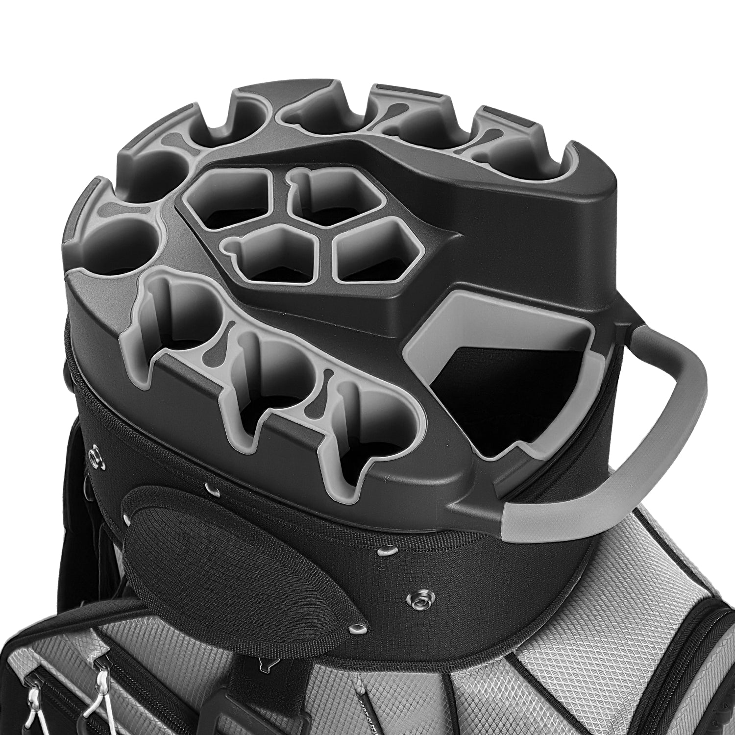 It uses 14 individual slots with secure locking grooves that hold clubs firmly in place—even during cart movement or rough terrain.