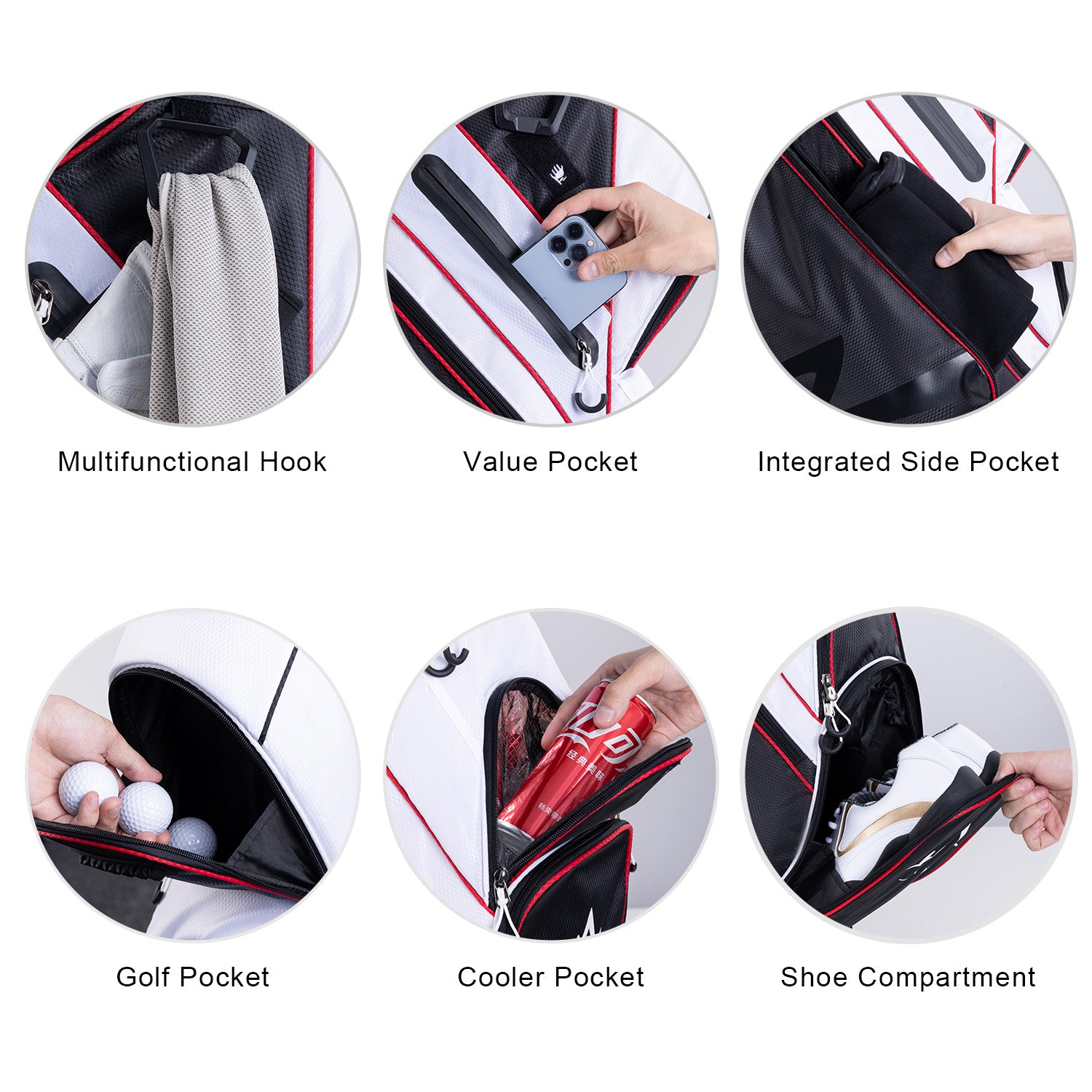 In addition to the 14 compartments, extra storage pockets offer ample space for carrying golf apparel, shoes, gloves, and other essentials, ensuring you're fully prepared for a successful day on the course