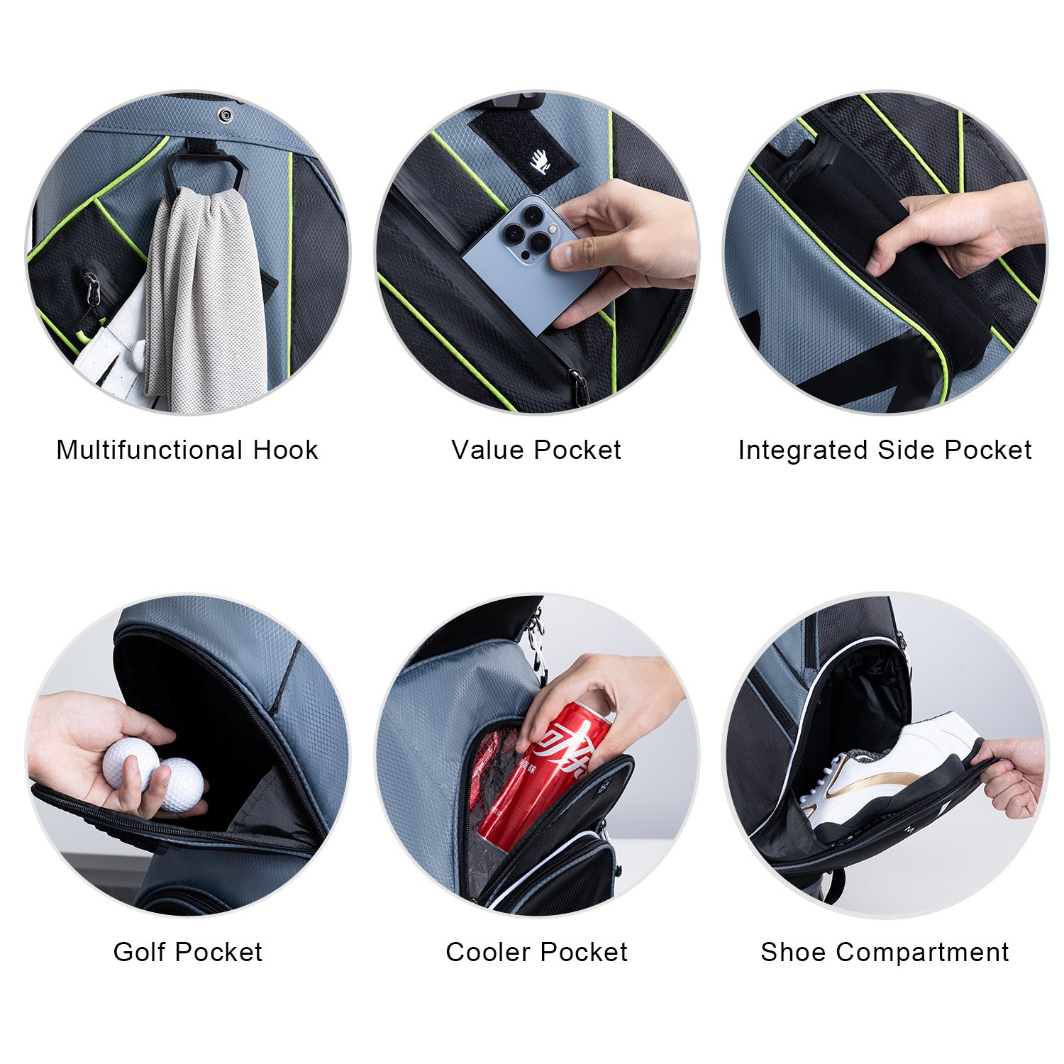 In addition to the 14 compartments, extra storage pockets offer ample space for carrying golf apparel, shoes, gloves, and other essentials, ensuring you're fully prepared for a successful day on the course