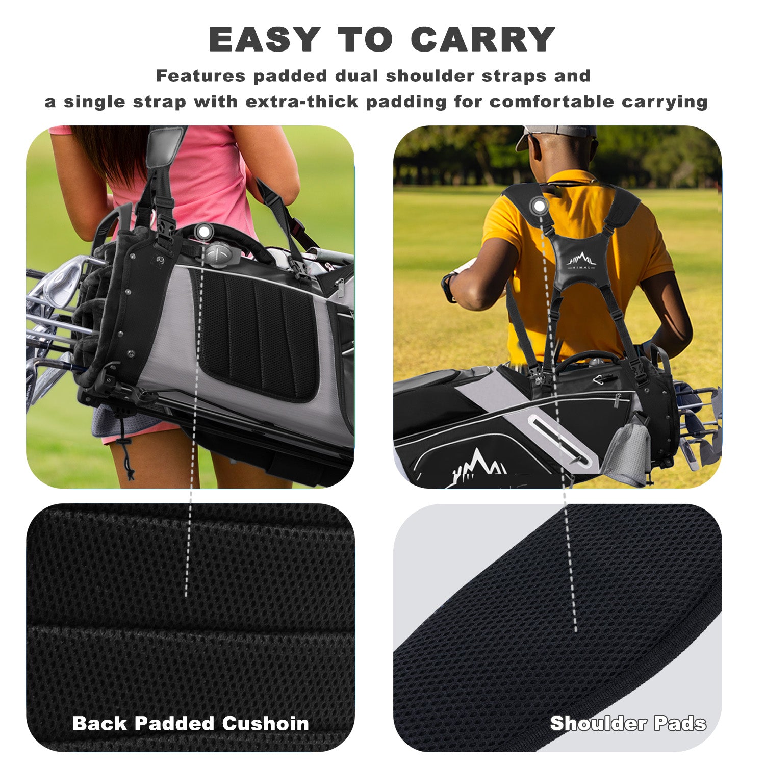 The dual shoulder straps, designed for players of all ages, make this golf bag comfortable with thick PE foam padding. The adjustable length customizes the fit, while the textured single shoulder strap relieves shoulder strain for maximum comfort