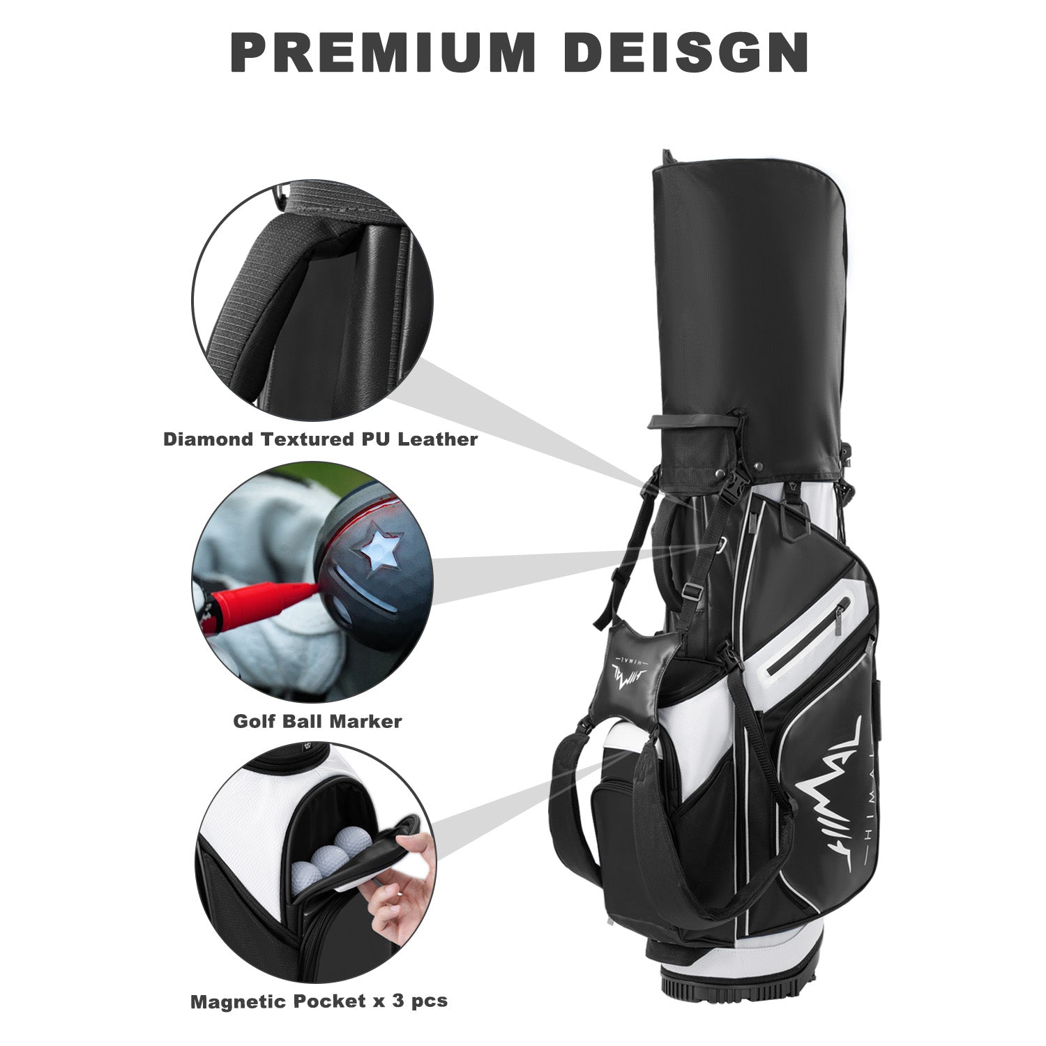 14-Way PU Leather Golf Stand Bag-Pure Black White