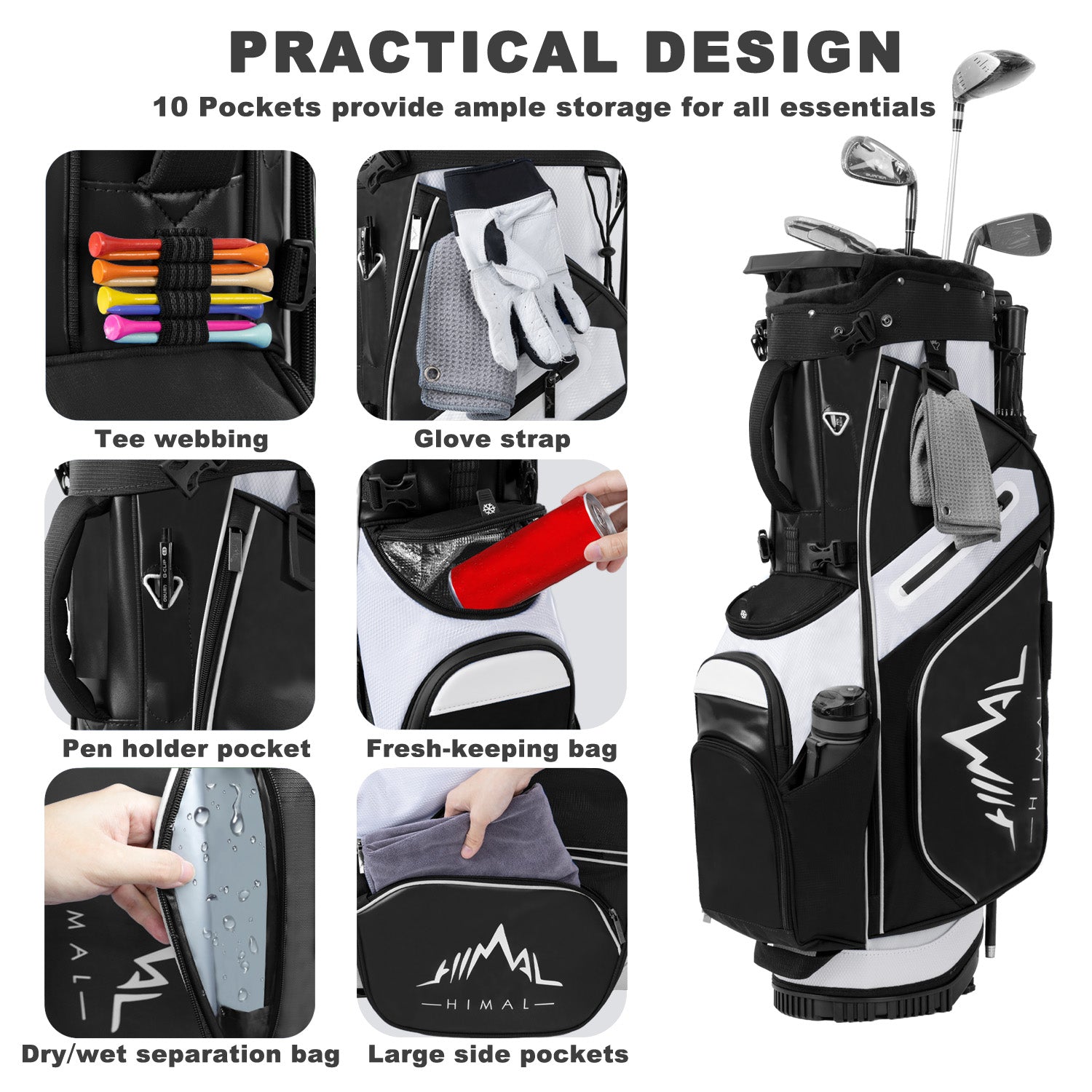 With 10 strategically placed pockets, including a water-protective valuables pocket, an insulated cooler bag, and front magnetic pocket for easy reach to golf balls, this golf club bag offers ample space to keep your gear organized and at your fingertips