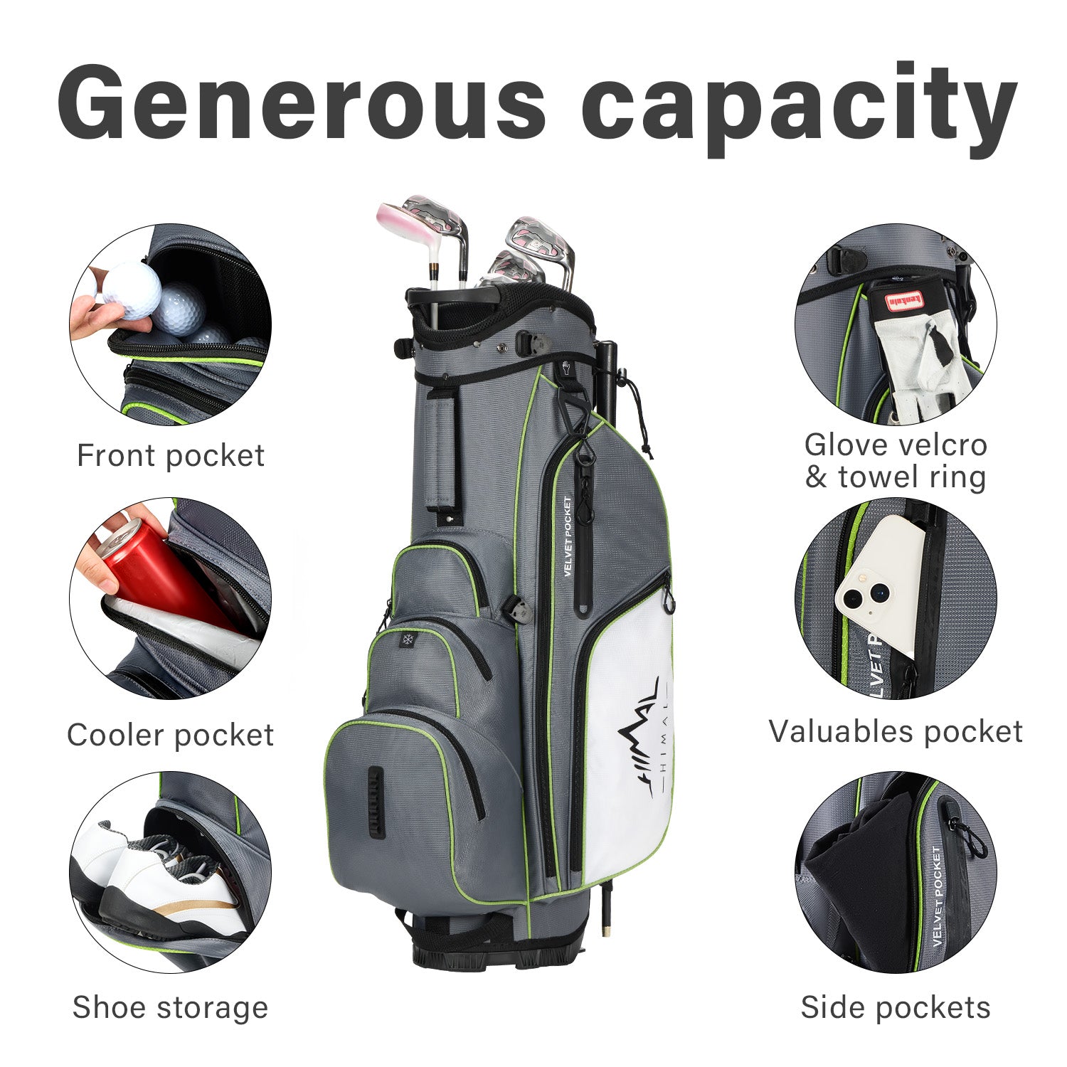 This golf bag equipped with 8 pockets, including 4 large side pockets for clothing, an insulated cooler for drinks, a waterproof valuables pocket