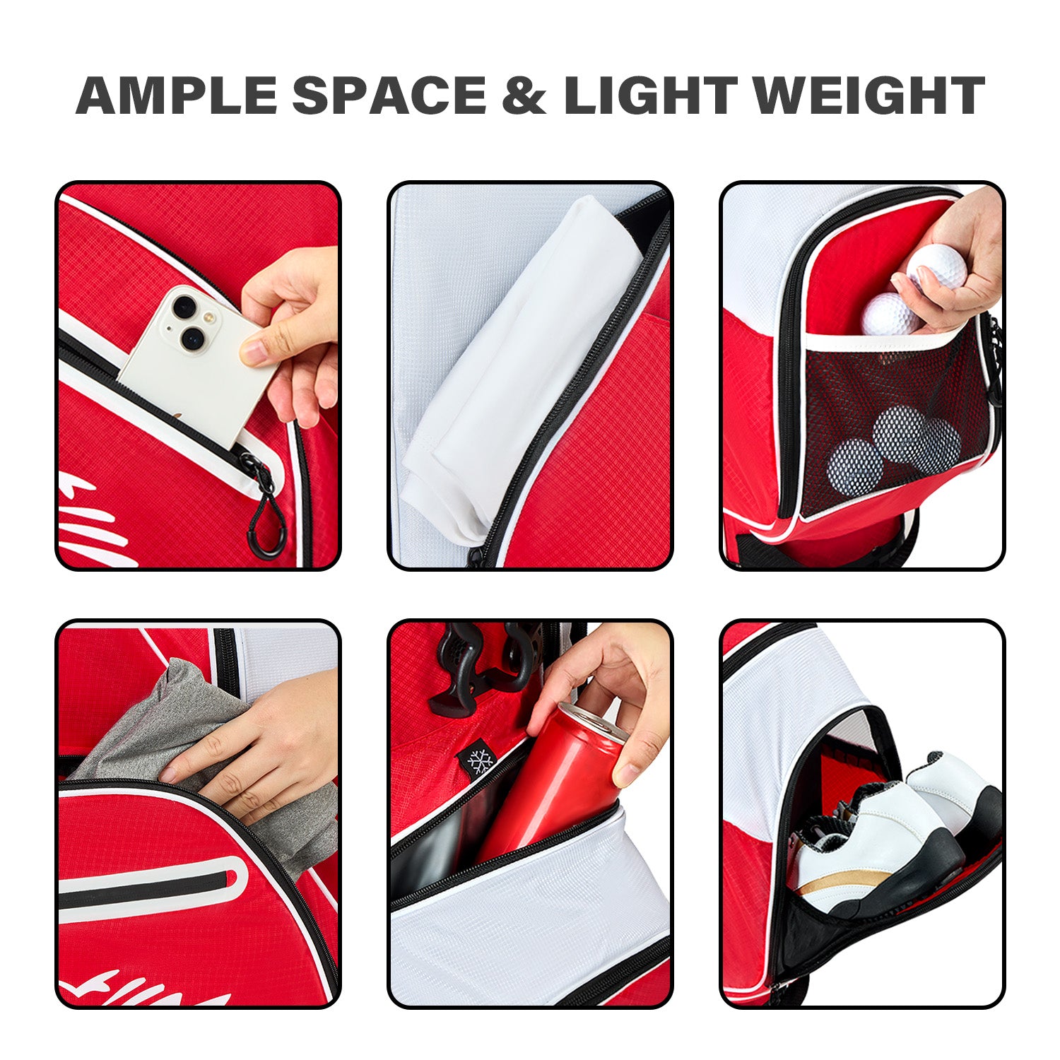 The ergonomically designed adjustable shoulder strap eases pressure. With a stylish design and unique color scheme, it blends practicality and aesthetics, making it the top choice for golf lovers
