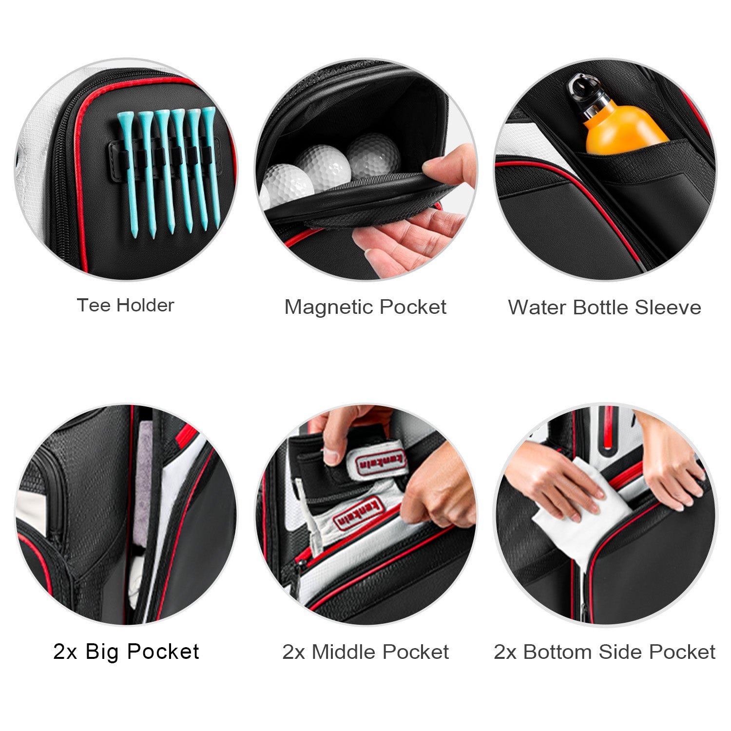 This golf cart bag features 14 pockets for organized storage of valuables and accessories. The magnetic pockets allow for quick and easy access, and it comes with a specialized rain cover for added protection