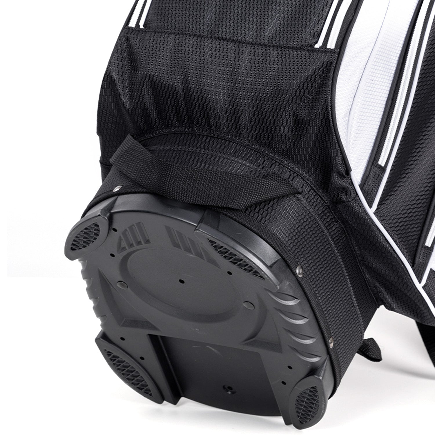 Designed with a robust plastic base, this golf cart bag ensures stability and durability on any terrain. It stands securely on the grass, making it a dependable companion for all your golf outings