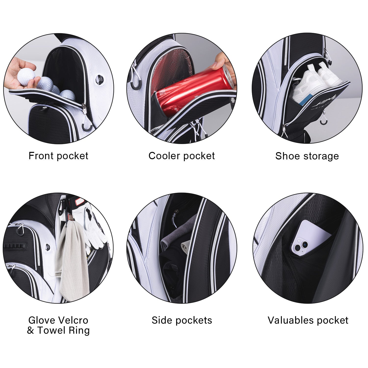 This golf cart bag includes a rain cover, towel ring, glove Velcro, multiple handles for easy lifting, and a padded single shoulder strap. These features make it easy to carry and use, suitable for most golf carts or golf carts