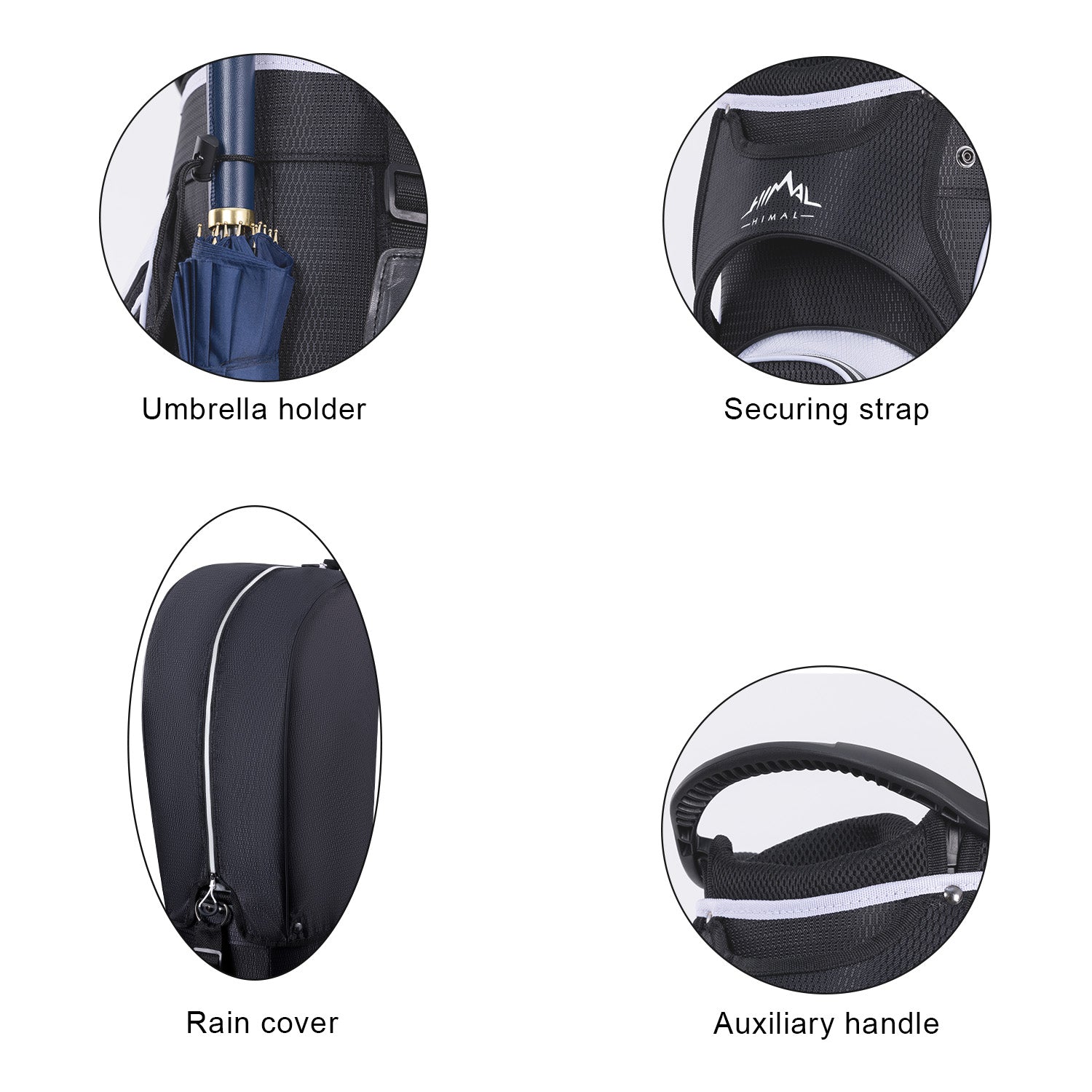 The bag includes an adjustable drawstring for holding an umbrella and hooks for gloves and towels, adding to its versatility and convenience. It's perfect for most push carts for golf bags and an excellent choice among golf cart bags for men