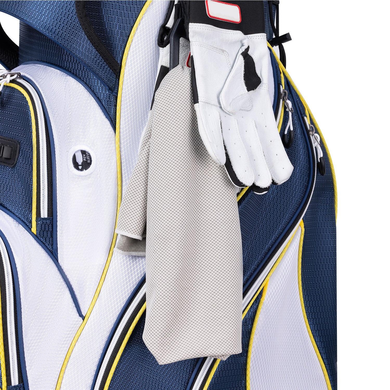 The bag includes an adjustable drawstring for holding an umbrella and hooks for gloves and towels, adding to its versatility and convenience. It's perfect for most push carts for golf bags and an excellent choice among golf cart bags for men