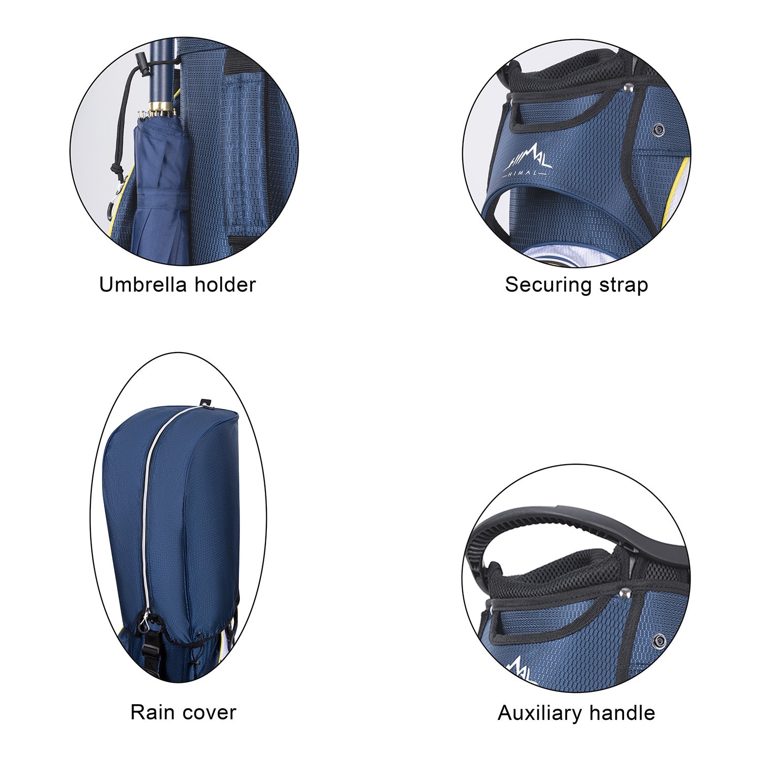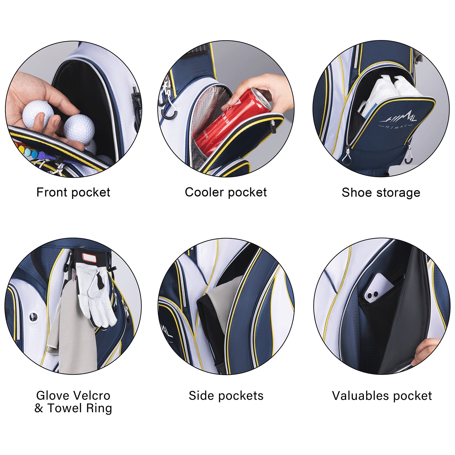 This golf cart bag includes a rain cover, towel ring, glove Velcro, multiple handles for easy lifting, and a padded single shoulder strap. These features make it easy to carry and use, suitable for most golf carts or golf carts