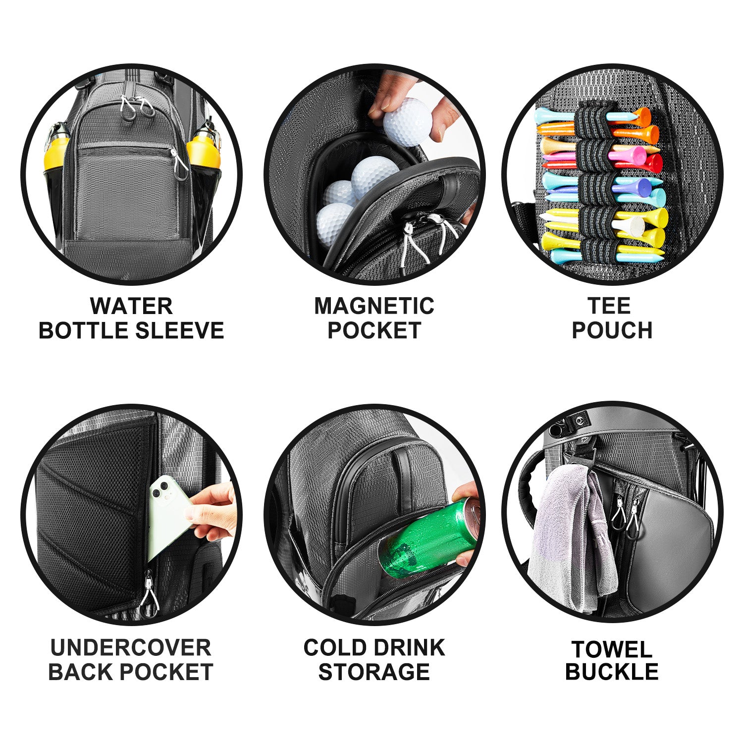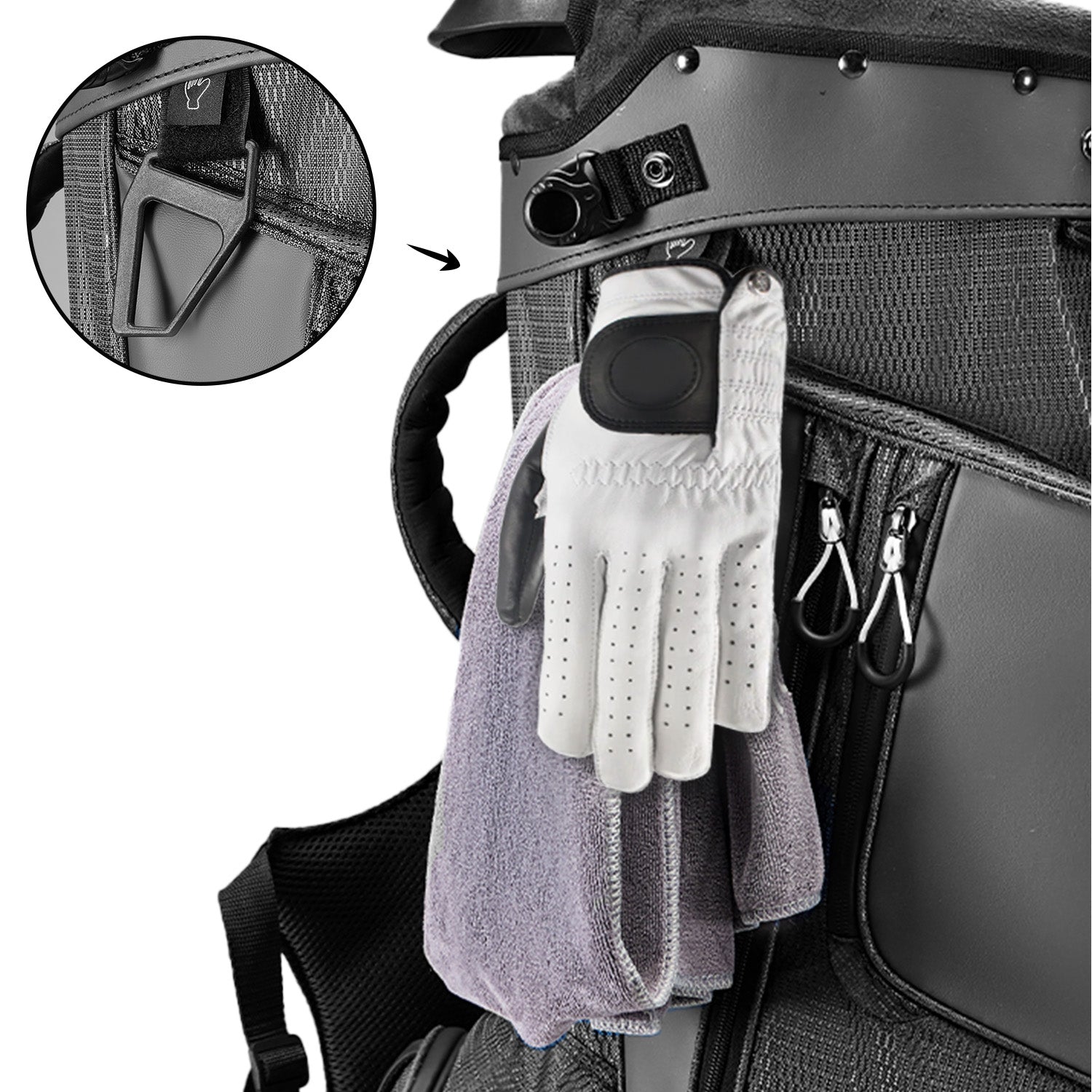 High density material and PU leather features splash-proof, rip-stop and durable. It has beautiful looks, long lifespan and good performance. This golf bag for men and women has some delightful features, including an umbrella holder, tee holder, dust cover hood, towel ring with Velcro glove attachment