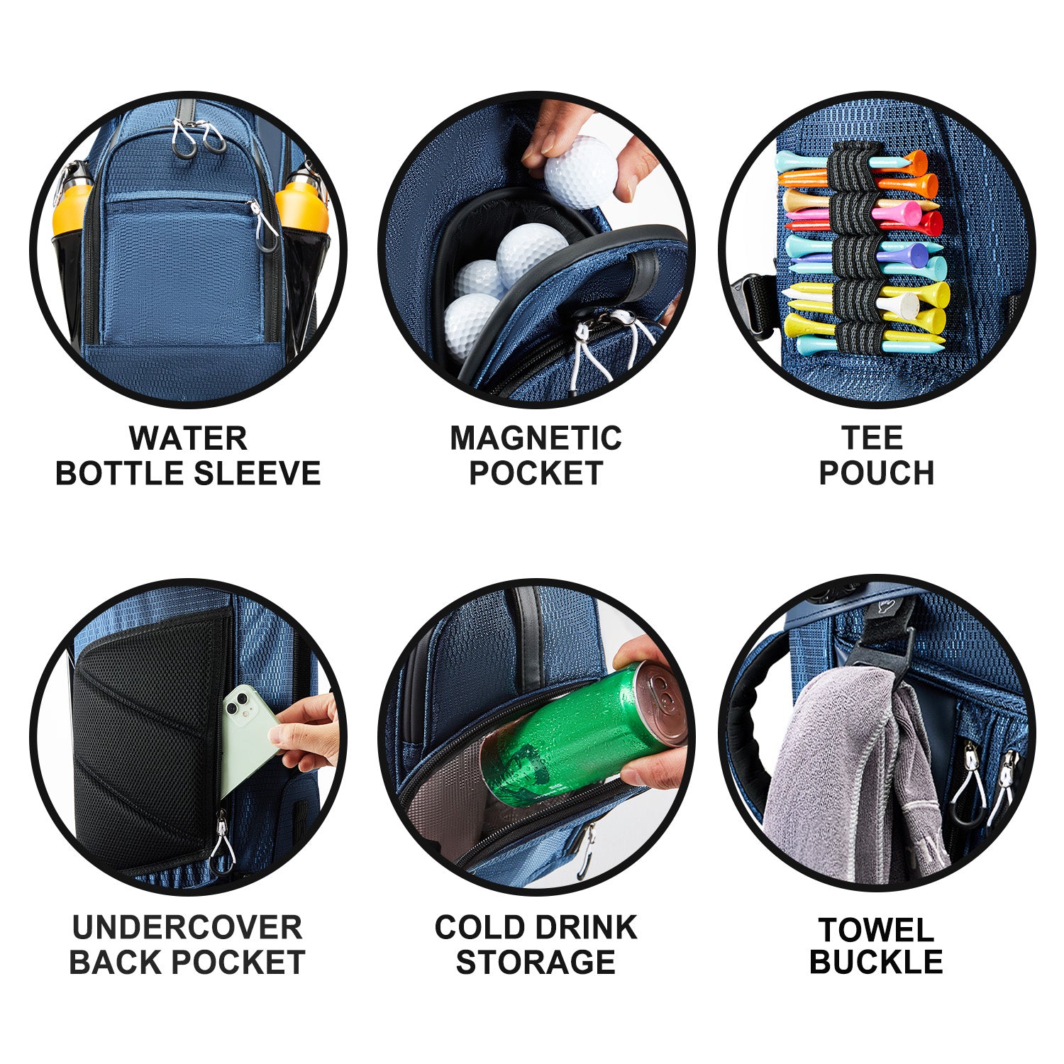 High density material and PU leather features splash-proof, rip-stop and durable. It has beautiful looks, long lifespan and good performance. This golf bag for men and women has some delightful features, including an umbrella holder, tee holder, dust cover hood, towel ring with Velcro glove attachment