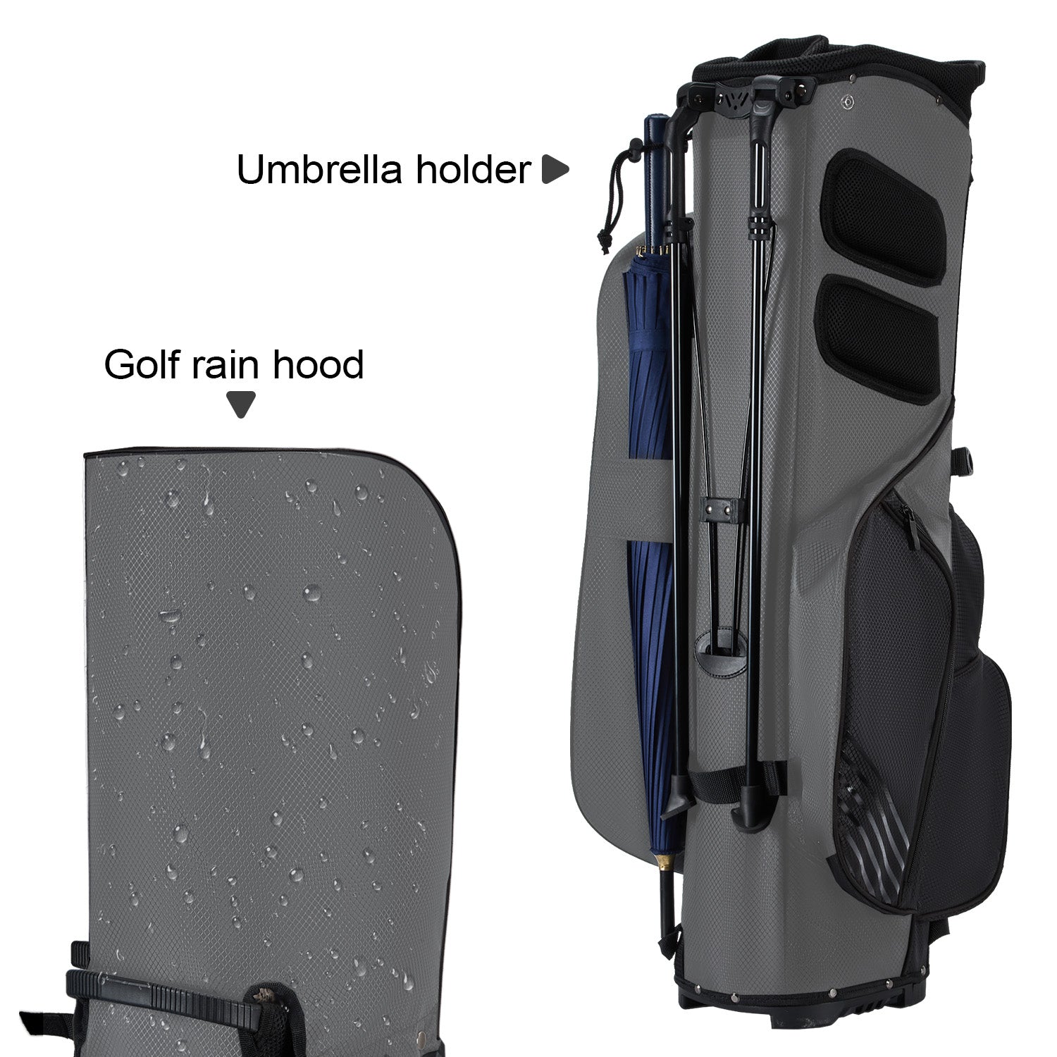 This golf stand bag features an umbrella holder, a rain hood, and a towel ring with a Velcro glove attachment, ensuring you’re fully equipped to face any weather conditions with ease and convenience