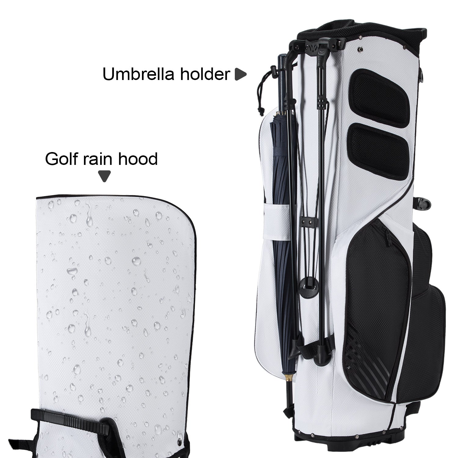 This golf stand bag features an umbrella holder, a rain hood, and a towel ring with a Velcro glove attachment, ensuring you’re fully equipped to face any weather conditions with ease and convenience