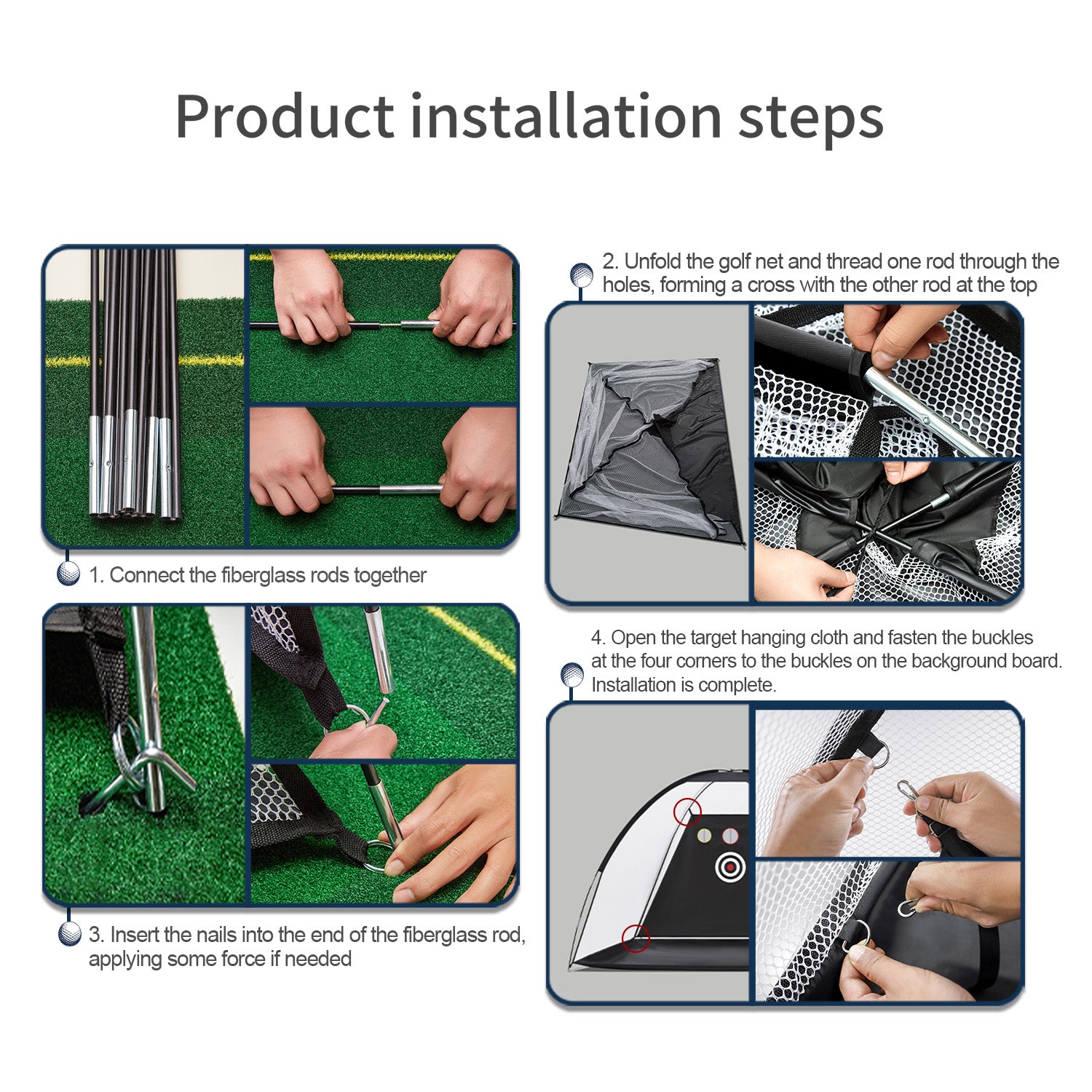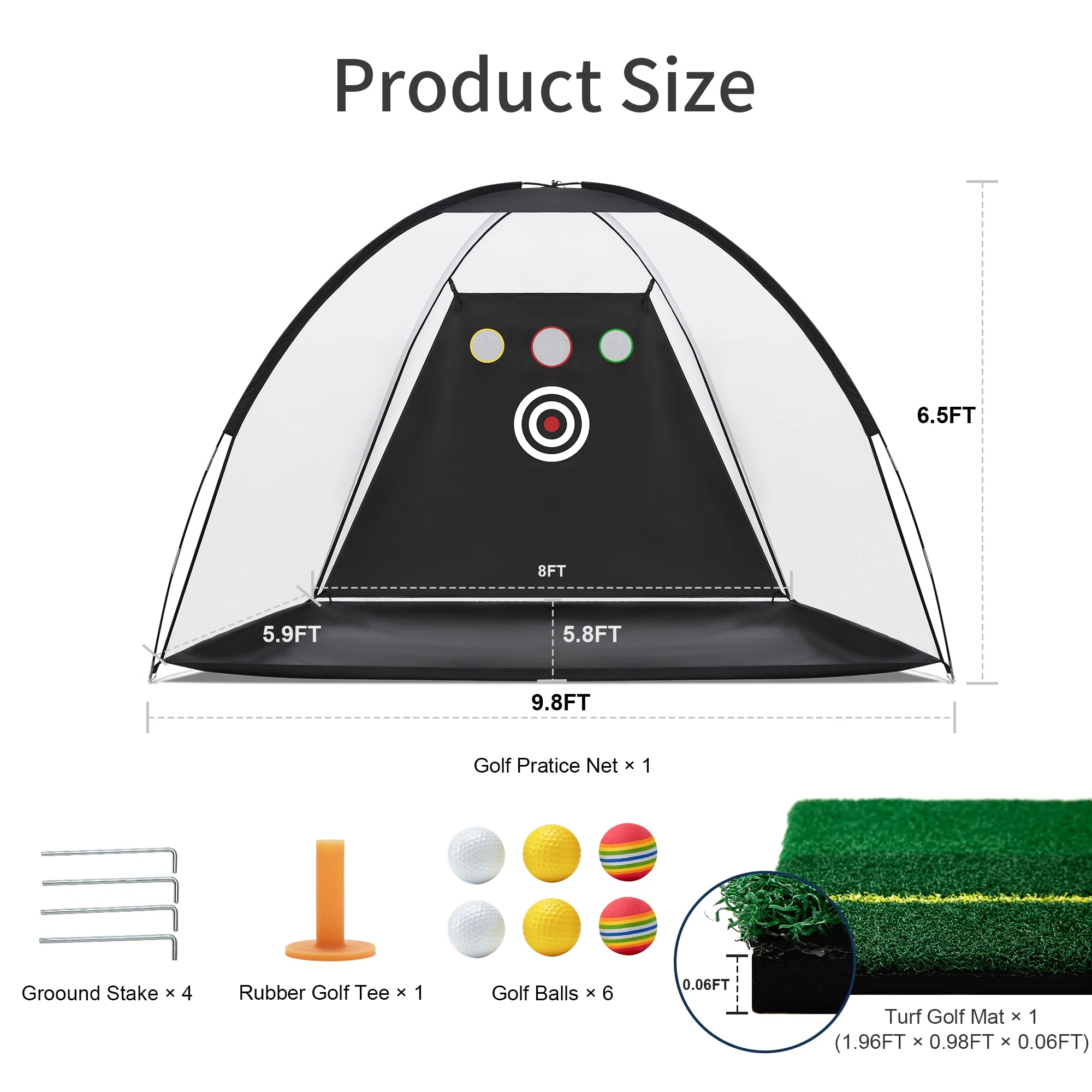Golf Pratice Net x 1,Golf Ball x 6,Turf Golf Mat x 1,Stake x 4,Golf Tee Holder x 4